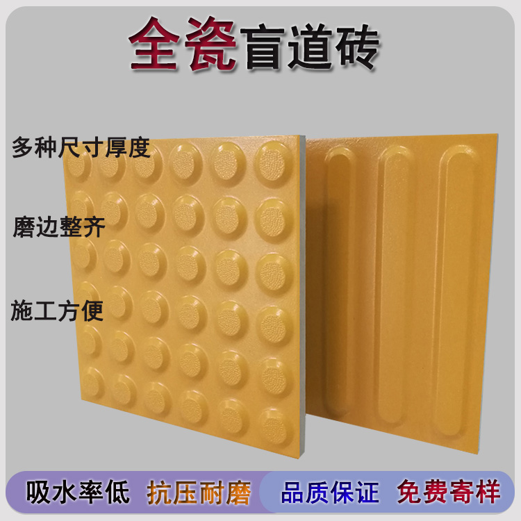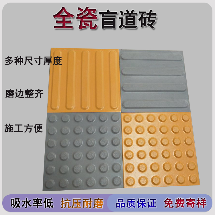 我公司生產的全瓷盲道磚有桔黃色和灰色兩種,桔黃顏色簡約大氣,高雅灰色時尚靚麗,以不同顏色的瓷磚進行混合搭配,能夠給人耳目一新,清新自然的視覺感受